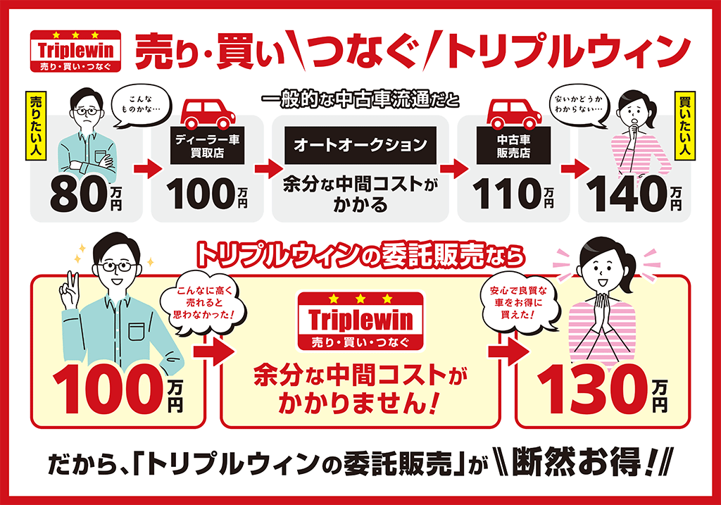 トリプルウィンの中古車流通は売りたいお客様から買いたいお客様の間に中間業者をはさまないので、一般的な流通と比較すると余計な費用はカットでき、その分高く売却する事はできるのです。